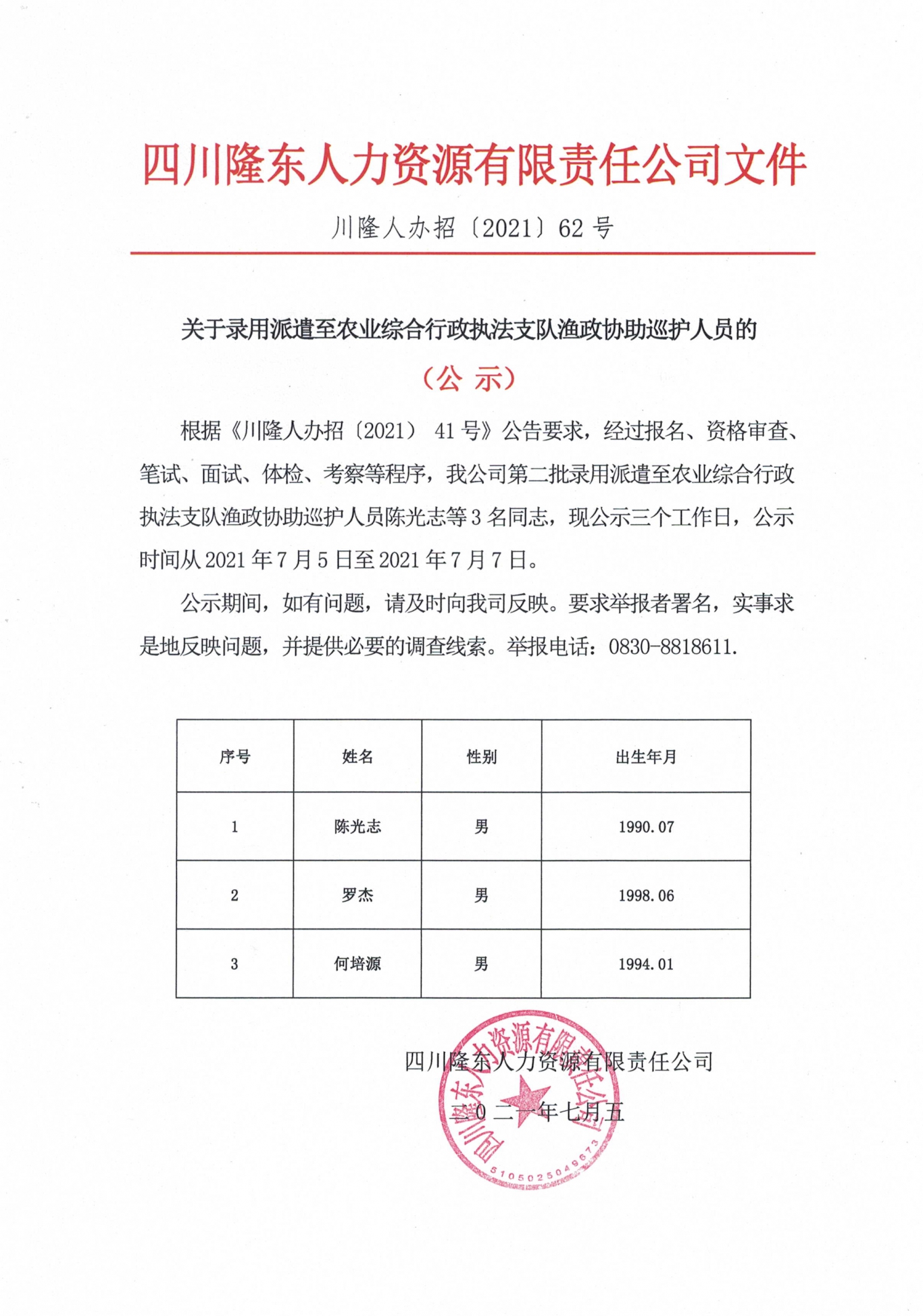 關(guān)于錄用派遣至農(nóng)業(yè)綜合行政執(zhí)法支隊漁政協(xié)助巡護人員的(公 示)