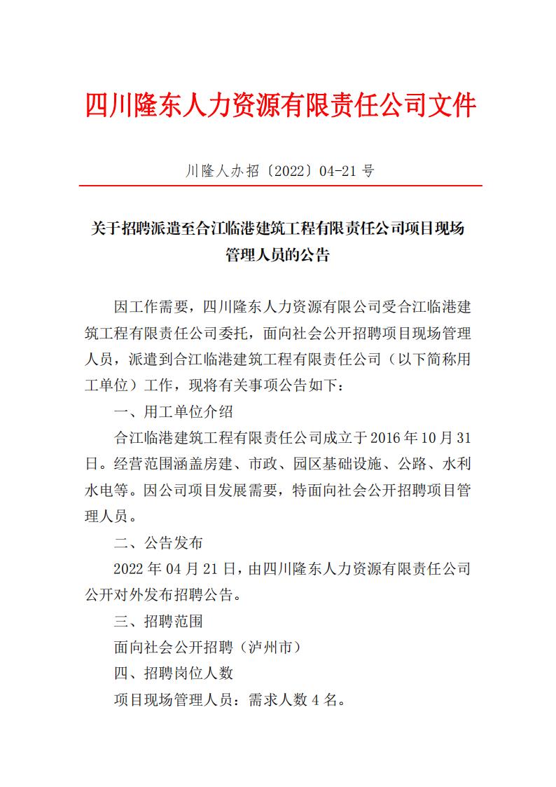 關(guān)于招聘派遣至合江臨港建筑工程有限責(zé)任公司項目現(xiàn)場管理人員的公告