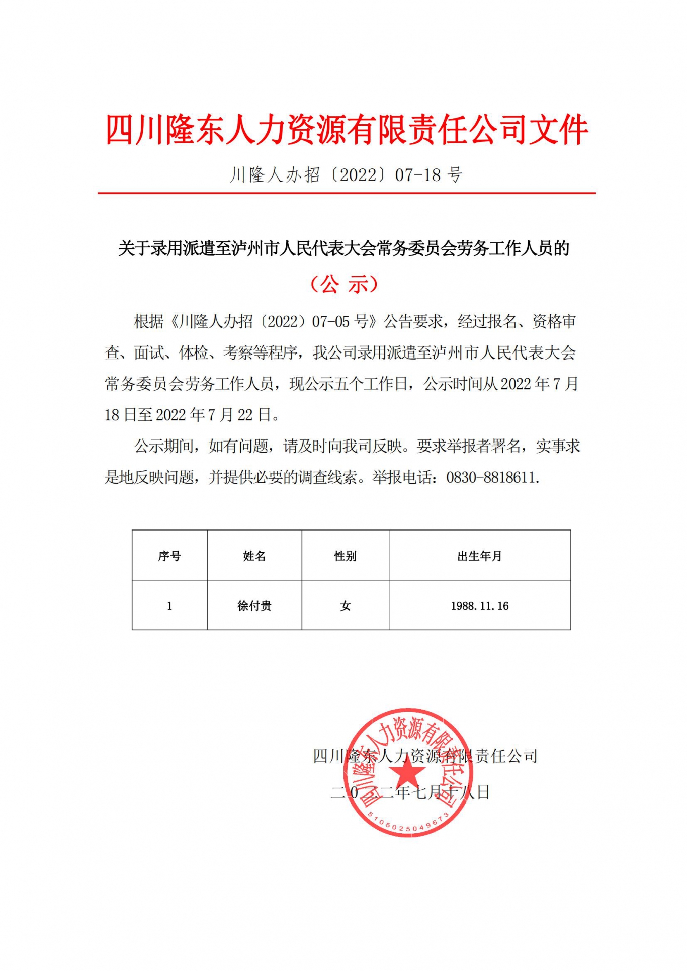 關(guān)于錄用派遣至瀘州市人民代表大會常務(wù)委員會勞務(wù)工作人員的 (公 示)