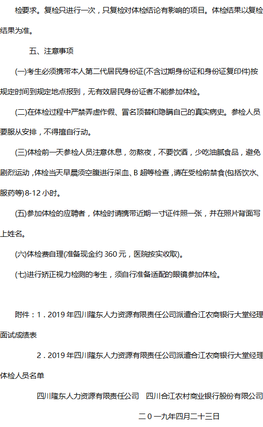 四川隆東人力資源有限責(zé)任公司派遣合江縣農(nóng)商銀行大堂經(jīng)理面試成績表排名及體檢有關(guān)事宜的公告