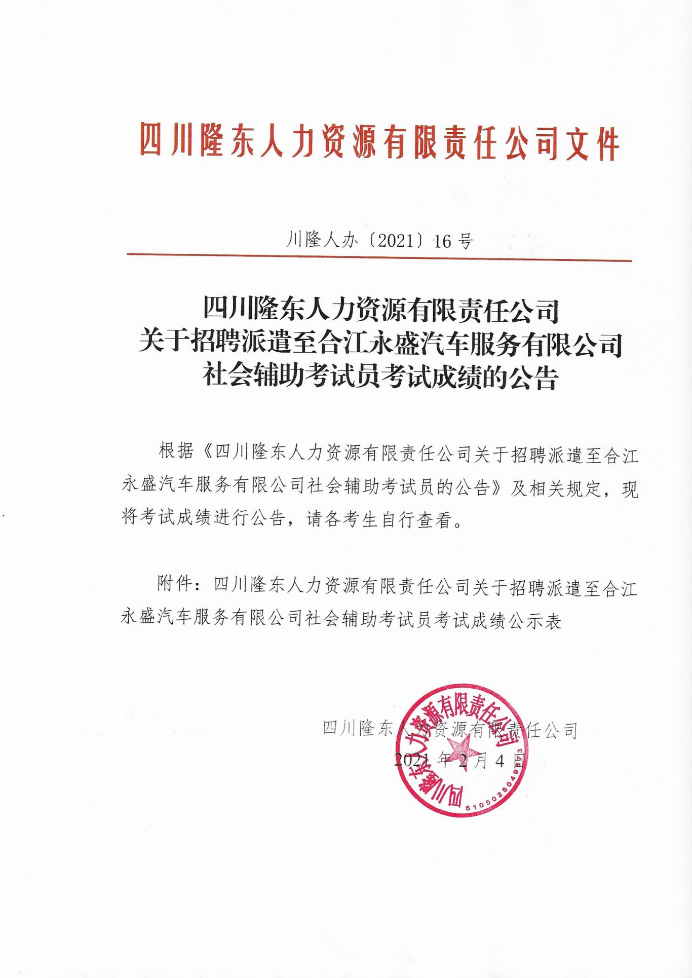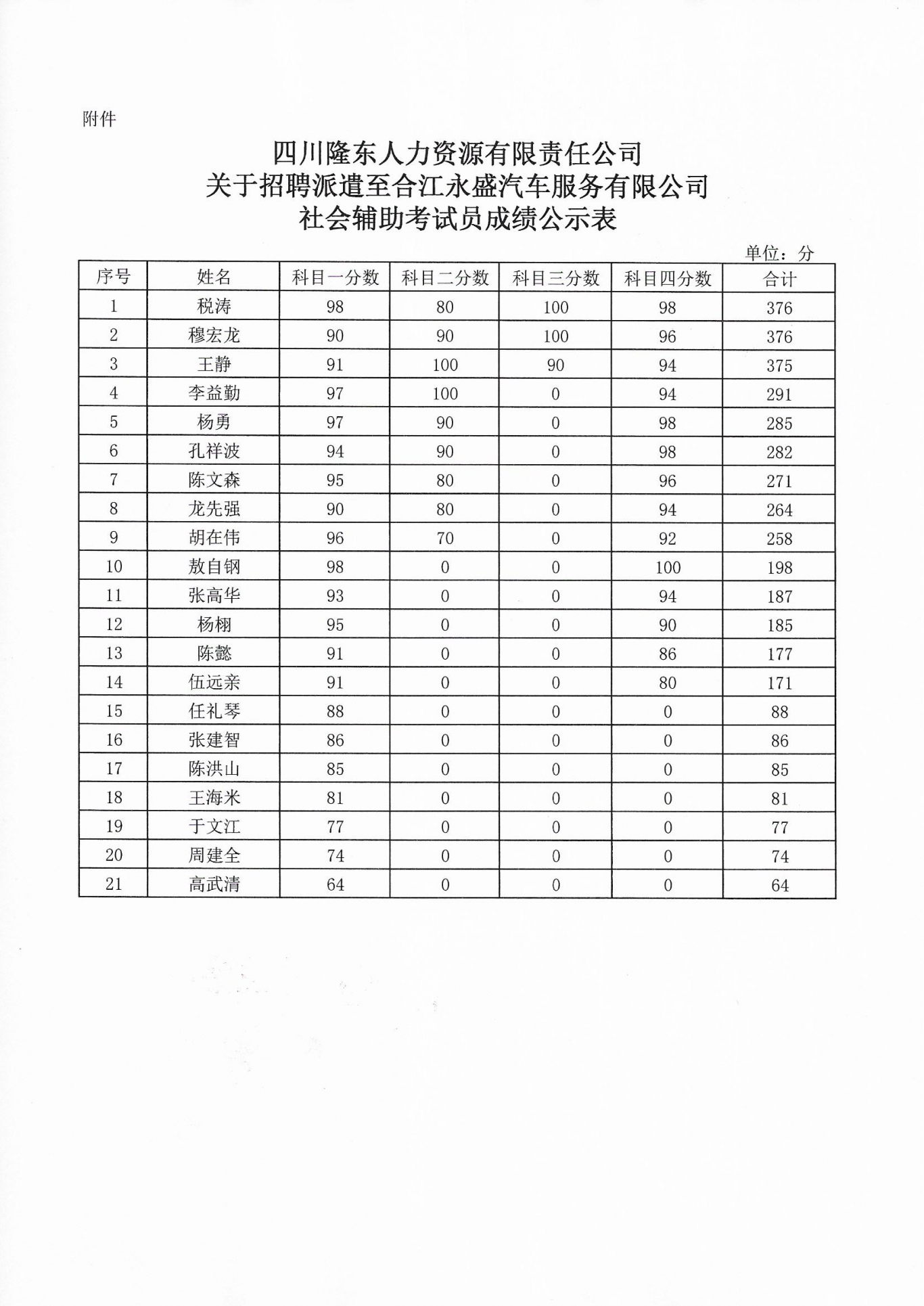 關(guān)于招聘派遣至合江永盛汽車服務(wù)有限公司 社會輔助考試員考試成績的公告