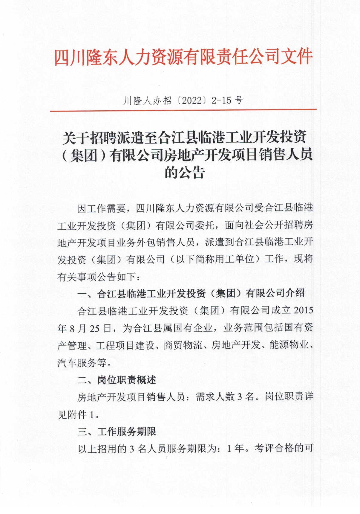 因工作需要,四川隆東人力資源有限公司受合江縣臨港工業(yè)開發(fā)投資(集團(tuán))有限公司委托,面向社會(huì)公開招聘房地產(chǎn)開發(fā)項(xiàng)目業(yè)務(wù)外包銷售人員,派遣到合江縣臨港工業(yè)開發(fā)投資(集團(tuán))有限公司(以下簡(jiǎn)稱用工單位)工作,現(xiàn)將有關(guān)事項(xiàng)公告如下.
