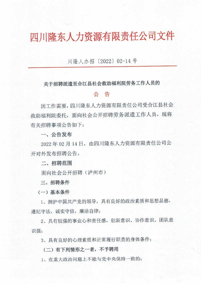 因工作需要,四川隆東人力資源有限責(zé)任公司受合江縣社會(huì)救助福利院委托,面向社會(huì)公開招聘勞務(wù)派遣工作人員,現(xiàn)將有關(guān)招聘事項(xiàng)公告如下: