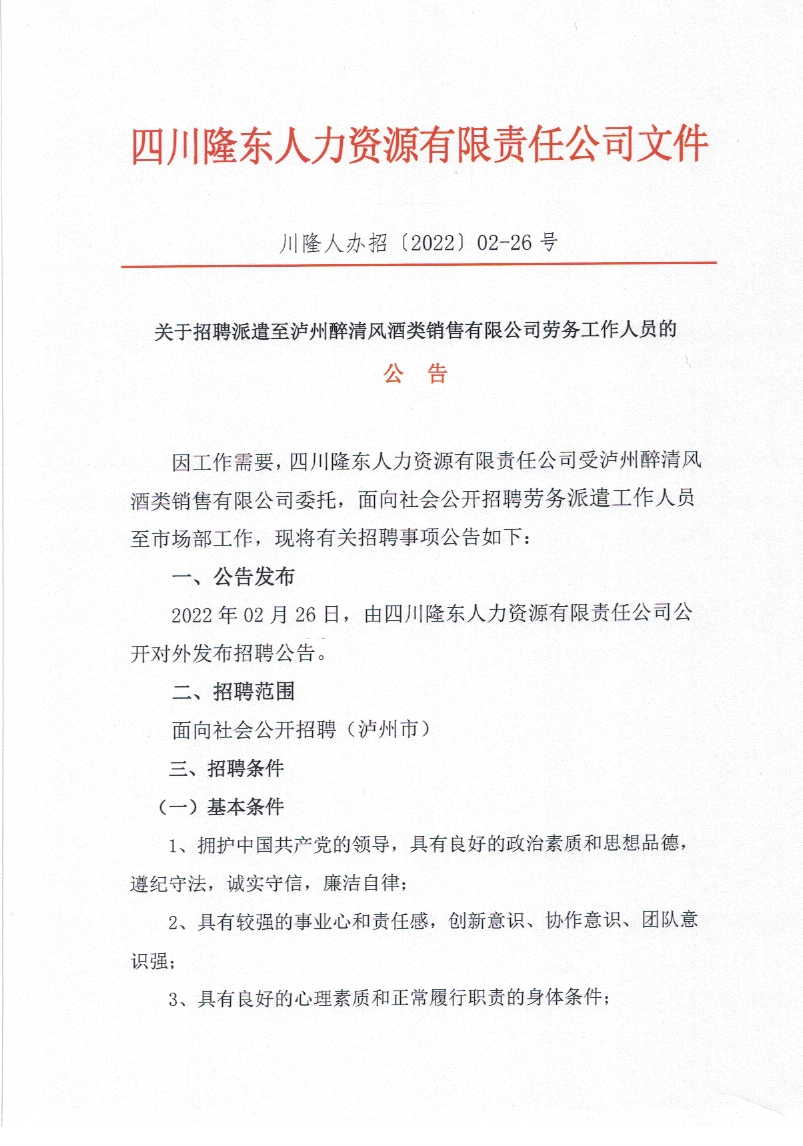 因工作需要,四川隆東人力資源有限責(zé)任公司受瀘州醉清風(fēng) 酒業(yè)股份有限公司委托,面向社會公開招聘勞務(wù)派遣工作人員至 生產(chǎn)技術(shù)部工作,現(xiàn)將有關(guān)招聘事項公告如下