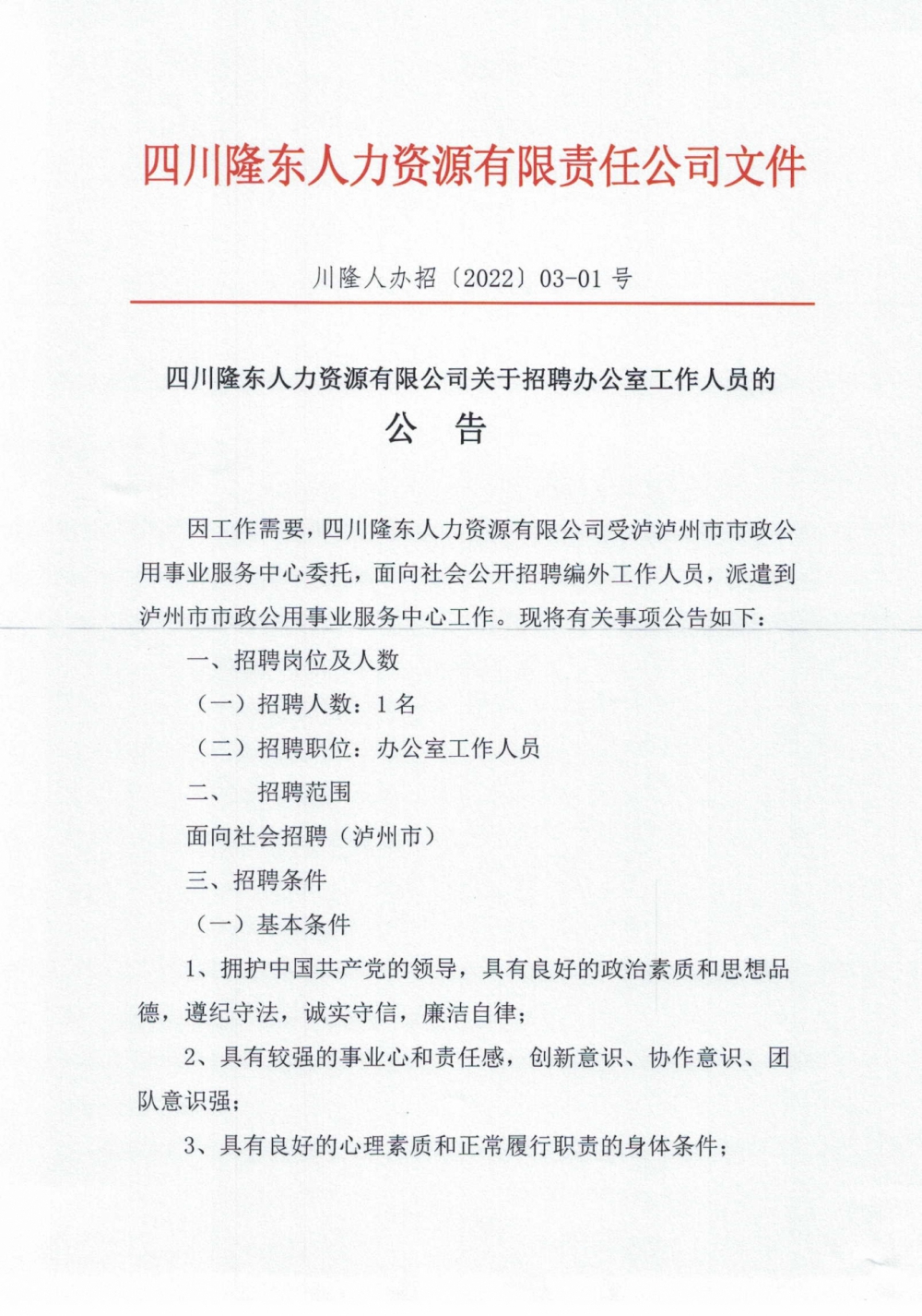 因工作需要,四川隆東人力資源有限責(zé)任公司受瀘州酒園實業(yè)有限公司委托,面向社會公開招聘勞務(wù)派遣工作人員至綜合管理崗位工作,現(xiàn)將有關(guān)招聘事項公告如下