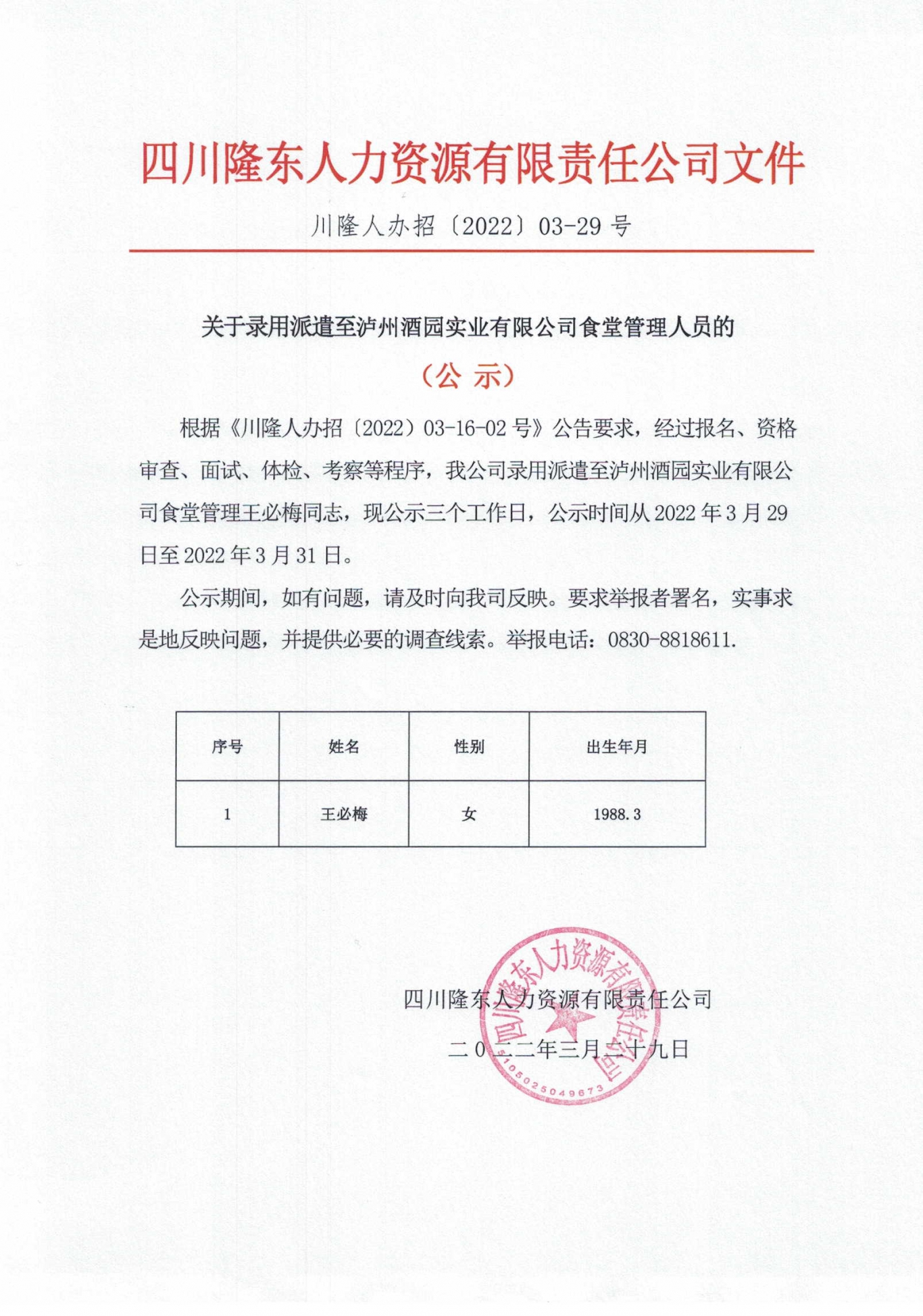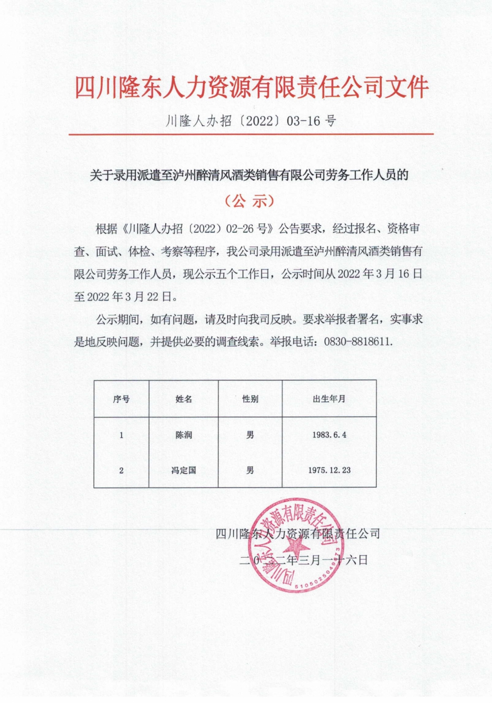根據(jù)《川隆人辦招〔2022)02-14號》公告要求,經(jīng)過報名、資格審查、面試、體檢、考察等程序,我公司錄用派遣至合江縣社會救助福利院勞務(wù)工作人員,現(xiàn)公示3日,公示時間從2022年2月25日至2022年2月27日。