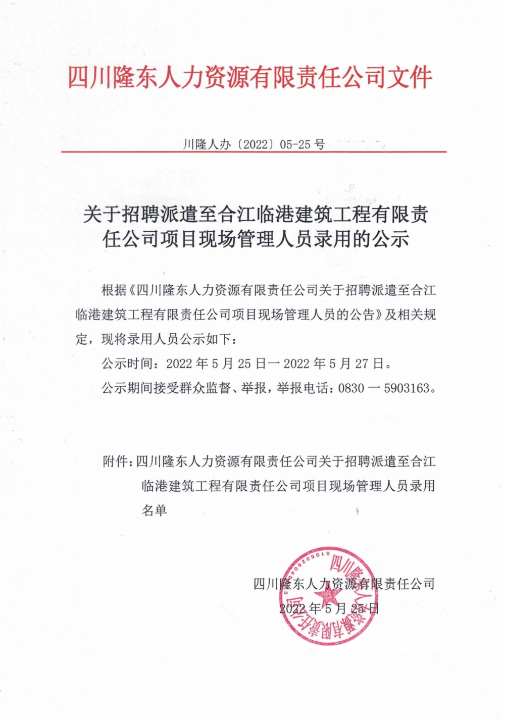 根據(jù)《四川隆東人力資源有限責(zé)任公司關(guān)于招聘派遣至合江臨港建筑工程有限責(zé)任公司項目現(xiàn)場管理人員的公告》及相關(guān)規(guī)定,現(xiàn)將錄用人員公示如下