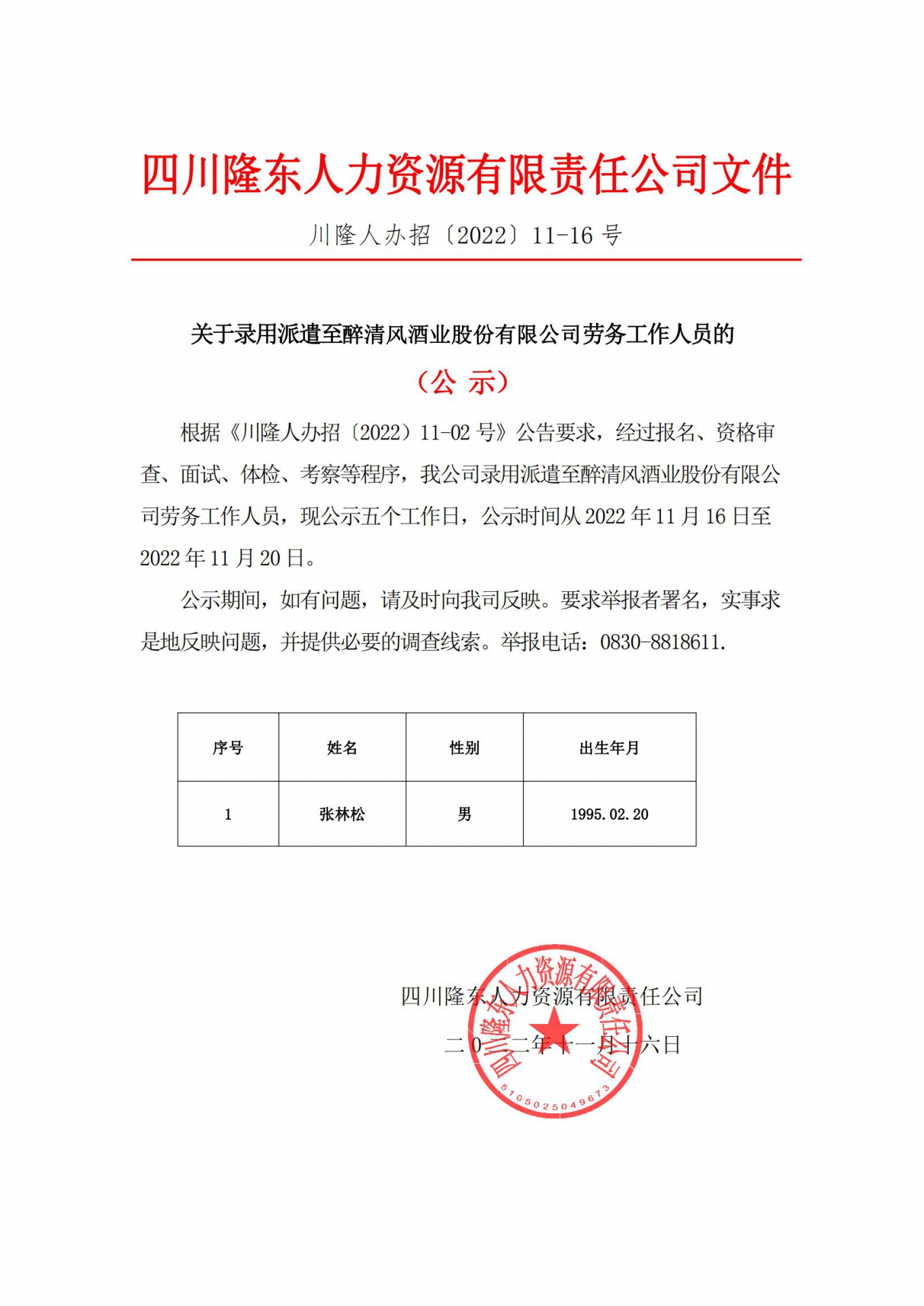 根據(jù)《川隆人辦招〔2022)11-02 號(hào)》公告要求,經(jīng)過報(bào)名、資格審查、面試、體檢、考察等程序,我公司錄用派遣至醉清風(fēng)酒業(yè)股份有限公司勞務(wù)工作人員,現(xiàn)公示五個(gè)工作日,公示時(shí)間從2022 年11 月16 日至2022 年11 月20 日。